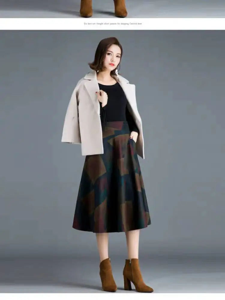 Woolen High-Waist Mid-Calf Checkered Knit Skirt